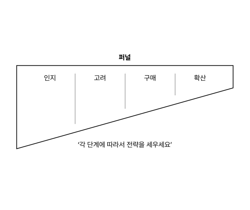 마케팅 퍼널은 인지 -> 고려 -> 구매 -> 확산으로 이루어져 있다.